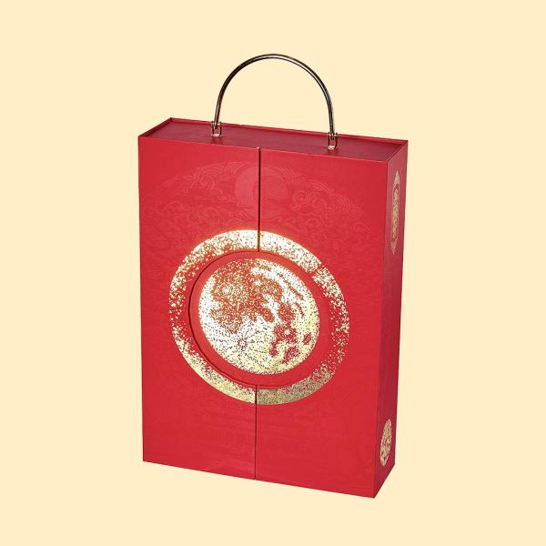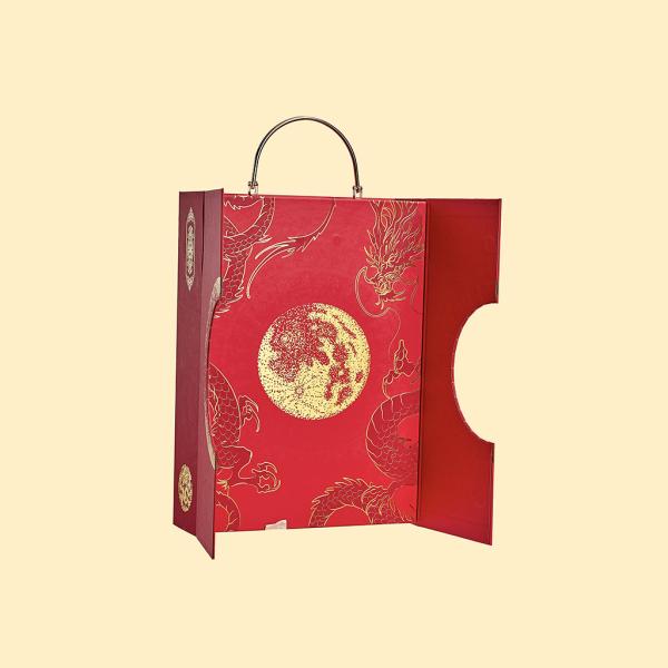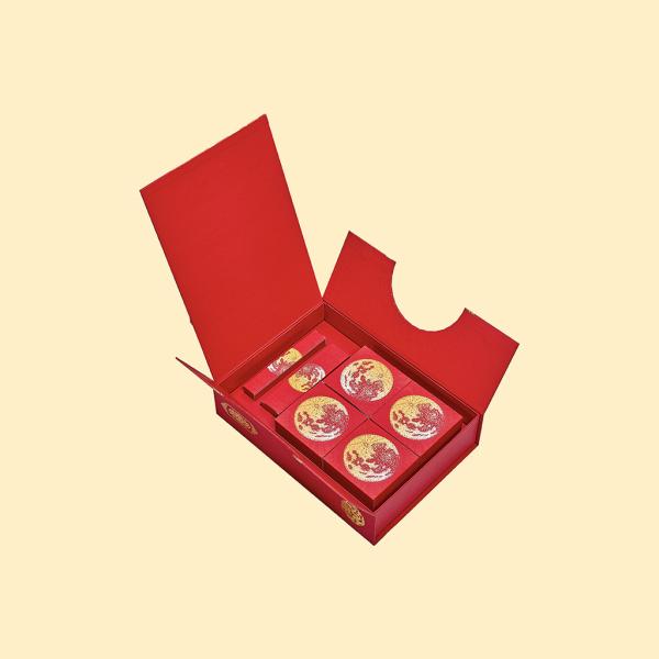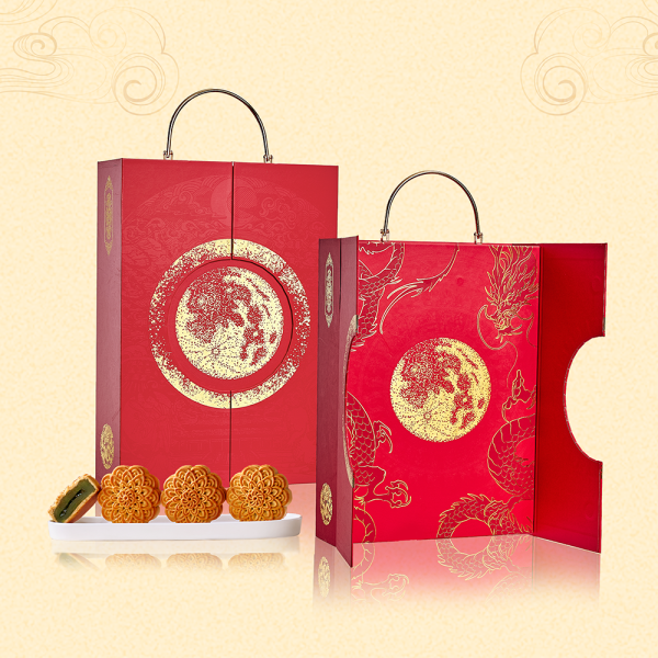 “Kim Long Vọng Nguyệt” mang hình ảnh rồng vàng uy nghi ngẩng nhìn trăng sáng, biểu tượng cho khát vọng vươn cao, thịnh vượng và trường tồn. Thiết kế hộp bánh trung thu này không chỉ gợi nhắc đến vẻ đẹp truyền thống của đêm rằm, mà còn tôn vinh tinh thần phồn vinh và khí chất quyền quý. Ánh trăng tròn như lời chúc cho một mùa đoàn viên viên mãn, vẹn toàn.