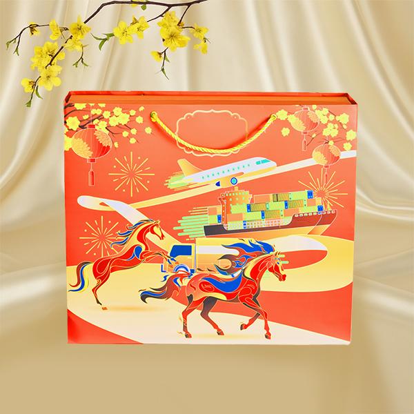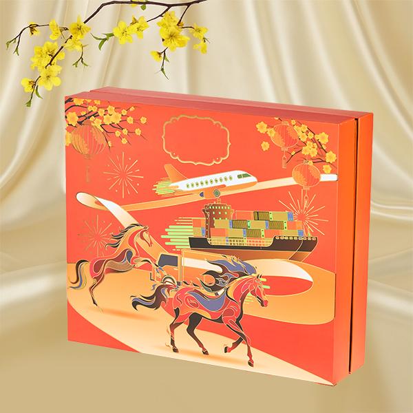- Hộp quà Tết sang trọng – ý nghĩa: Thiết kế tinh tế với sắc cam chủ đạo tượng trưng cho khởi đầu thuận lợi và năng lượng tích cực, phù hợp với hình ảnh chuyên nghiệp của doanh nghiệp.