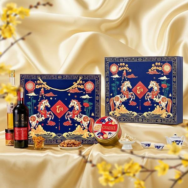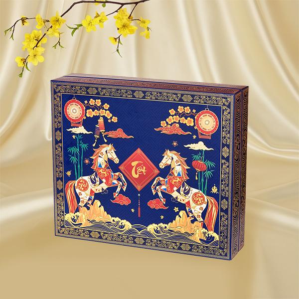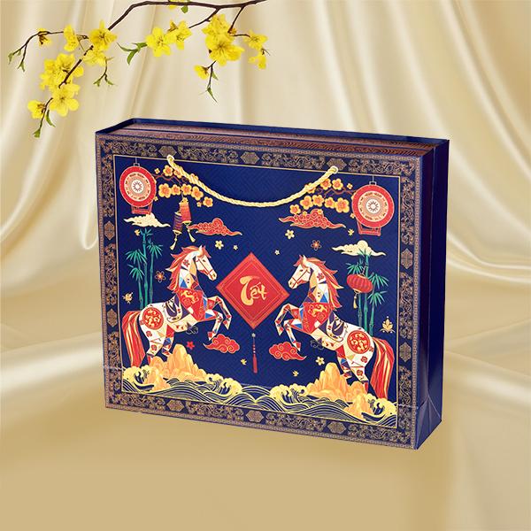 Hộp Quà Tết TẾT PHÚ QUÝ SONA được thiết kế mang đậm hơi thở Việt – với sắc xanh lam sang trọng kết hợp họa tiết song mã tung vó giữa trời xuân.