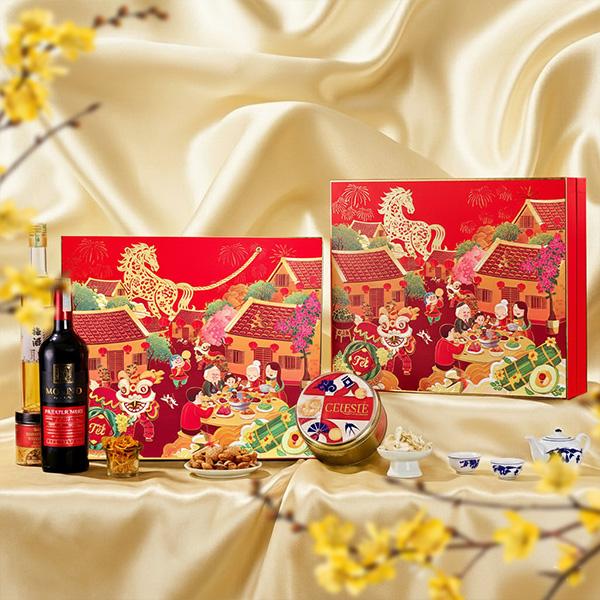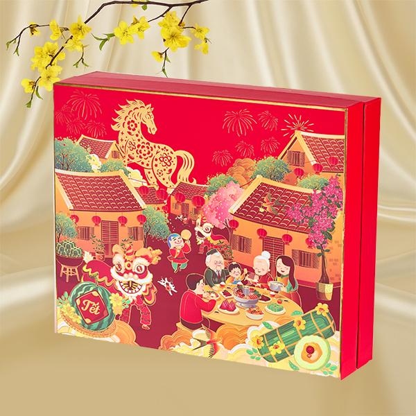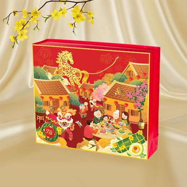 Hộp Quà Tết TẾT SUM VẦY SONA tái hiện khung cảnh Tết cổ truyền – hình ảnh gia đình quây quần bên mâm cỗ, múa lân, pháo hoa và tuấn mã khải vận.