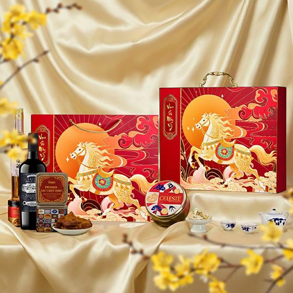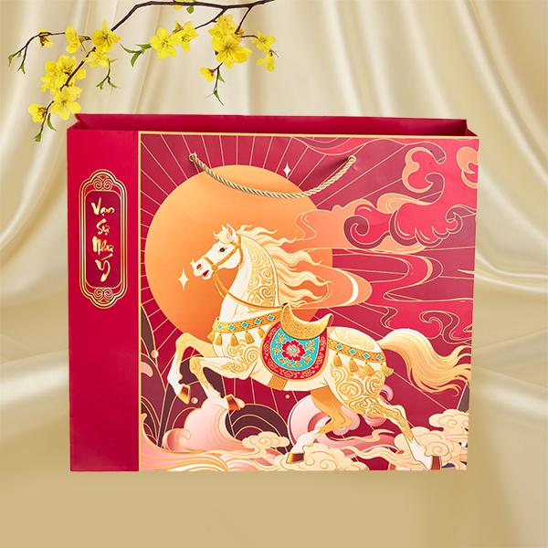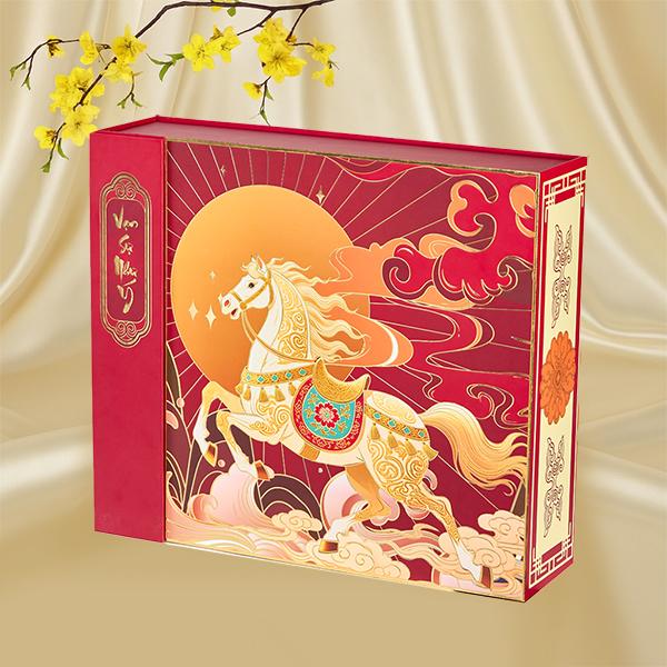 - Hộp quà mang biểu tượng thành công – khởi vận hanh thông: hình tượng ngựa vàng phi nước đại gửi gắm lời chúc “Vạn Sự Như Ý – Mã Đáo Thành Công”.